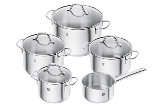 Edelstahl 18/10, Inhalt: 1x Stieltopf Ø 16 cm 1,5 l), je 1 x Kochtopf mit Deckel Ø 16 cm (2 l), 20 cm (3,5 l) und 24 cm (6 l), 1 x Bratentopf mit D...