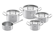 Edelstahl 18/10, satiniert, Inhalt: je 1x Kochtopf Ø 16, 20 und 24 cm, 1 x Kochtopf Ø 24 cm, 1 x Stielkasserolle Ø 16 cm, für saftiges Gargut: Metalldeckel mit Wölbung, damit der Dampf nach unten tropft, breiter Schüttrand, integrierte Messskala, Kaltmetallgriffe, spülmaschinengeeignet, Cookstar® Allherdboden, für alle Herdarten inklusive Induktion geeignet, backofengeeignet bis 230 °C·Artikel mit Vertriebsbindung