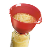 Universal Trichter-Set. Das Universal Trichter-Set von Cuisipro besteht aus hitzebeständigem Kunststoff und ist somit auch für Suppen, heißen Fruchtkompott usw. geeignet. Der große Trichter ist vor allem für die Abfüllung von Einmachgläsern geeignet. Der große Trichter besitzt zusätzlich einen herausnehmbaren Siebeinsatz. Der mittlere Trichter besitzt einen speziellen Schnabel zum Abfüllen an schwer zugänglichen Stellen wie z.B. Pfeffermühlen. Der kleine Trichter eignet sich für das Abfüllen von Flaschen mit einem schalem Hals. Sowohl der kleine als auch der mittlere Trichter haben zusätzliche Luftkanäle für einen besseren Durchfluss. Der Universaltrichter ist spülmaschinenfest.