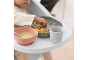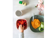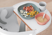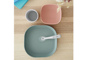 Silikon, Inhalt: 1 Teller, 1 Schüssel mit Saugnapf, 1 Becher, 1 Lernlöffel (2. Altersstufe), Design und Form sollen das Essen erleichtern, Teller und Schüssel mit Saugnapf zum Haften auf dem Tisch, spülmaschinengeeignet·eucalyptus grün
