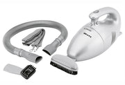 Handstaubsauger zum Absaugen von: Möbeln, Polstern, Bilderrahmen, Gardinen, Büchern, Computern, Autos u. v. m., permanenter Staubfilter, leicht zu reinigen, geringes Gewicht, 6 m langes Anschlusskabel, aufrecht abstellbar (platzsparend), flexibler "Saugrüssel" mit Fugendüse, kleine und große Bürste, Schulterriemen, 230 Volt, 50 Hz, PAL 58, 700 Watt, Konturenstecker CEE 7/17·metallic