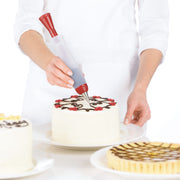Ideal für feinste Verzierungen und Schriften von Cremes und Zuckerguss für Torten, Desserts und auch herzhaften Speisen. Der Profi-Dekorationsstift von Cuisipro mit 2 Tüllen sorgt für einfaches und genaues Dosieren individueller Verzierungen. Der weiche Silikonkörper des Stifts liegt angenehm in der Hand und reagiert auf minimale Berührungen. Einfach den Stift ohne Tülle in die gewünschte Sauce eintauchten durch Nachlassen von Druck füllt sich das Vakuum. Gewünschte Tülle aufschrauchen und durch leichtes Zusammendrücken die Sauce punktgenau dosieren- Perfekt für detaillierte, mm-feine Verzierungen. Ein feiner runder und tropfenförmiger Aufsatz wird mitgeliefert, dieser kann im oberen Ende des Kolbens aufbewahrt werden. Spülmaschinengeeignet.