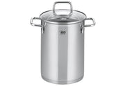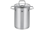 Edelstahl 18/8 -18/10, Wandstärke ca. 0,6 mm, Bodenstärke ca. 4,1 mm, verkapselter Hartlötboden innen satiniert mit Volumenskala, außen hochglanzpoliert mit ELO Logo, Edelstahl Drahtgriffe, geschweißt Glasdeckel mit stoßfestem EDS Ring und weißem ELO Logo, EDS Bügelgriff mit Fingerschutzplatte, spülmaschinengeeignet, für alle Herdarten geeignet, auch für Induktion Ø 16 cm