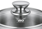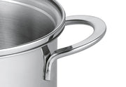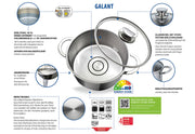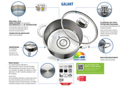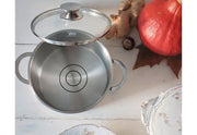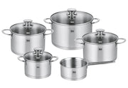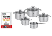 Edelstahl / Glas, Inhalt: je 1 x Fleischtopf mit Glasdeckel Ø 16 cm, 1,7 l, Bratentopf mit Glasdeckel Ø 20 cm, 2,7 l, Fleischtopf mit Glasdeckel Ø 20 cm, 3,4, Fleischtopf mit Glasdeckel Ø 24 cm, 5,8 l, Stielkasserolle Ø 16 cm, 1,3, energiesparender gelöteter Kapselboden, mit Abgießrand, Literskala und Öl-Dosier-System, Glasdeckel mit stoßfestem Edelstahlrand, spülmaschinengeeignet, backofenfest bis 180°C mit Glasdeckel (ohne Deckel bis 240° C), für alle Herdarten geeignet