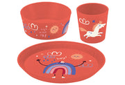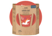 bio-zirkuläres Material + Holz, Inhalt: 1 x Becher 190 ml, 1 x Schale 400 ml, 1 x Teller Ø 20,5 cm, robust, leicht und stapelbar, lebensmittelecht, mikrowellengeeignet max. 360 W / max. 100°C, 100% recycelbar, 100% CO2-neutral, 100% reines Material, melaminfrei, spülmaschinengeeignet··organic red