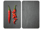 Schieferoptik, Inhalt: 1 x uni, 1 x mit Motiv "Chilis", kratzfeste, porenfreie hygienische Oberfläche, robust und schlagfest, geruchsneutral, hitzebeständig bis 200 °C, 8 rutschfeste Füße in unterschiedlichen Höhen für verschiedene Herdarten, für Glaskeramik-, Elektro- und Gasherde geeignet···· (LxBxH): je 30x1,8-5,5x52 cm