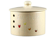 Steinzeug-Vorratstopf für Zwiebeln, aus Naturton dicht gesintert, porenfrei bei 1250°C, im offenen Feuer gebrannt, ideal zur gesunden, traditionellen Aufbewahrung von Lebensmitteln, dickwandig, daher kühlend, atmungsaktive Lagerung durch Luftlöcher rundum sorgen für eine gute Zirkulation und wirken der Fäulnisbildung entgegen, Glasuren sind blei-, cadmium- und zinnfrei, lebensmittelecht, kantenfest, spülmaschinengeeignet·weiß Ø 18 cm, H 16 cm