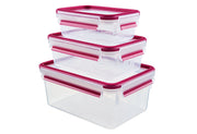 Deckel / Unterteil Kunststoff Polypropylen (PP), eingespritzes Gummi besteht aus Thermoplastischen Elastomeren (TPE), transportsicherer Clipverschluss, mit EMSA FRISCHE-Dichtung, platzsparend ineinander stapelbar, geeignet für Babynahrung, gefrierschrankgeeignet, mikrowellengeeignet, spülmaschinengeeignet, Inhalt: 550 ml (16,3x11,3x5,8 cm), 1 l (19,5x13,5x7 cm), 2,3 l (22,5x16,3x9,9 cm)·himbeere / transparent 1 x 550 ml, 1 x 1 l, 1 x 2,3 l