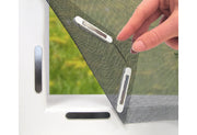 ABS / Polyester / Metall, mit Magnetbefestigung zum Anklicken, ausschneidbar für alle Fenster bis max. 150x130 cm, Fenster lässt sich weiterhin komplett öffnen, rückstandsfrei abzulösen