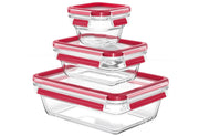 Borosilikatglas, Deckel: Kunststoff (Polypropylen), Inhalt: 1 x 180 ml, 1 x 450 ml, 1 x 1,3 l, stapelbar, bis 420°C ofenfest, mit FRISCHE-Dichtung, hygienisch, dicht, unbedenklich, gefriergeeignet, mikrowellengeeignet, spülmaschinenfest·transparent / rot