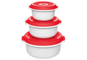 Kunststoff (PP), Inhalt: 1 x Topf 500 ml, 1 x Topf 1 l und 1 x Topf 1,5 l, Deckel mit 2-fach Nutzen: zum Frischhalten und als Spritzschutz in der Mikrowelle (Dose darf in der Mikrowelle nicht fest verschlossen werden!), Einfrieren, Frischhalten, Auftauen, Erhitzen, Servieren, beste Durchlässigkeit durch Spezial-Kunststoff, spülmaschinenfest und pflegeleicht·weiß / rot