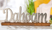 Großer edler heimatlicher Schriftzug auf Holzbase in brüniertem Aluminium, Modell: Dahoam , Maße 43 x 17 x 5 cm, Farbe Natur und Aluminium, tolle Deko fürs Cafe oder Zuhause.