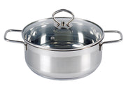 Edelstahl rostfrei, Materialstärke 0,5 mm, mit satiniertem Dekorband und Edelstahl-Rand, Glasdeckel mit Lüftungsloch, 3 mm Kapselboden, Edelstahl-Griffe, für alle Herdarten inkl. Induktion geeignet, spülmaschinenbeständig 2,2 l, Ø 20 cm
