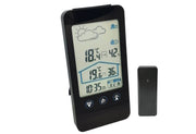 digitales Innen- / Außen-Thermometer, digitales Innen- / Außen-Hygrometer, Funkuhr, 12 / 24 Stundenanzeige, Wecker, Kalender (Tag, Datum, Wochentag), Wettervorhersage, Mondphasen-Anzeige, Bedienung über 3 Touch-Button·schwarz (LxBxH): 2,2x8x16 cm