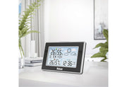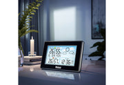 Kunststoff, Innen- und Außenthermometer – Anzeige der Temperatur in °C oder °F, Innen- und Außenhygrometer – Anzeige der Luftfeuchtigkeit in %, Funkuhr (DCF77), Displaybeleuchtung auf Knopfdruck, Wettervorhersage mit Wettersymbolen, Kalender, Weckfunktion mit Weckwiederholung, Mondphasenanzeige, 12-/ 24 Stunden Anzeige·schwarz / silber (BxHxT): 15x9,6x2,2 cm
