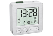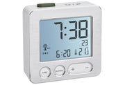 Aluminiumfront, mit Anzeige von Innentemperatur und Datum, Alarm mit Snooze-Funktion, Hintergrundbeleuchtung, Messbereich Temperatur: -9 bis +50 °C (+14 bis +122 °F), 2 x 1,5 V AAA Batterien, nicht enthalten·silberfarben (LxBxH): 6,6x2,2x6,8 cm