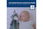 Polyester/ABS, mit Klettband, herausnehmbares Soundmodul, 6 verschiedene voreingestellte Geräusche, wie z.B. den Herzschlag der Mutter, weißes Rauschen, Naturgeräusche und 3 Arten von Schlafliedern, die Musik schaltet sich automatisch nach ca. 10 Minuten ab, optional kann der Geräusch-bzw. Bewegungssensor das zuletzt gespielte Geräusch wieder einschalten, wenn das Baby weint, benötigt 3 AAA Batterien (nicht enthalten), nach Entfernung des Soundmoduls, kann das Kuscheltuch mit der Hand gewaschen und an der Luft getrocknet werden·eisblau (BxHxT): 20x40x10 cm